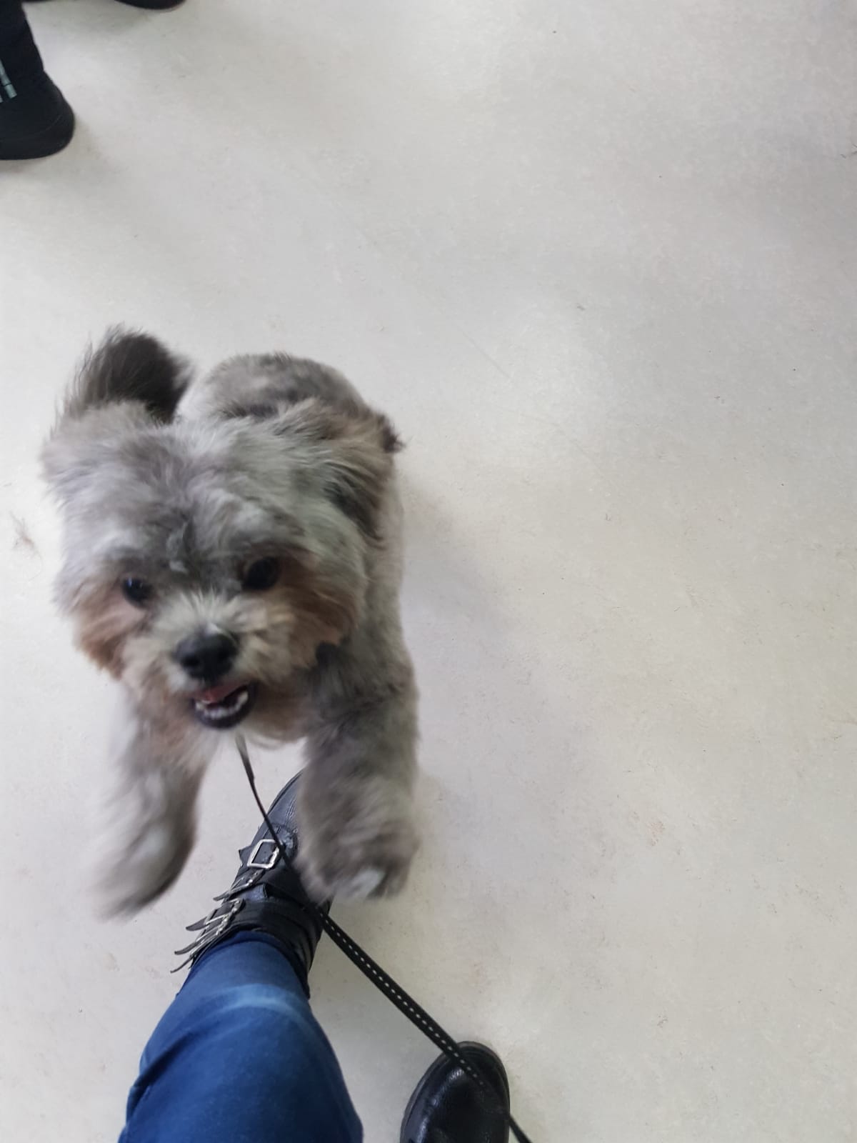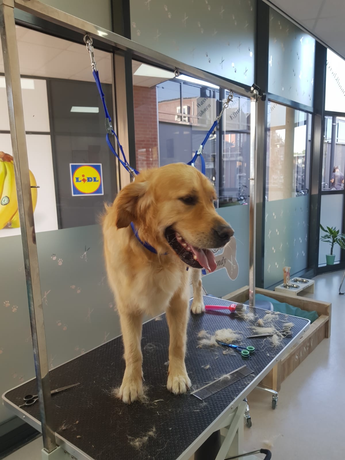 Hier wordt Loeka zijn kop geknipt door Sandy